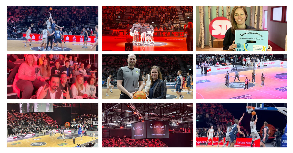 Die Ballübergabe kurz vor Tipoff führte Geschäftsführerin Franca Frank durch. In der Halbzeit präsentierte sie zudem im Rahmen eines Interviews eine durch SanData und die Falcons veranstaltete Aktion, bei zum Spenden an das  Deutsche Down-Syndrom InfoCenter in Lauf a. d. Pegnitz aufgerufen wurde. Ganze 660 EUR kamen an diesem Abend allein durch Bargeld-Spenden in dafür vorgesehenen Boxen zusammen. Diesen Betrag erhöhten wir auf 2.500 EUR.