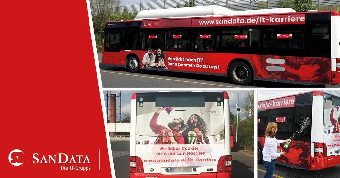 Im Rahmen einer Recruiting-Kampagne wurden die Computerfreaks auf einem Linienbus der Verkehrs-Aktiengesellschaft Nürnberg (VAG) großflächig abgebildet und sind von nun an auf verschiedenen Routen innerhalb der fränkischen Metropole zu bewundern – eine Premiere für den IT-Dienstleister. Dabei zieren die Gesichter der Nerds sowohl die Seitenwände als auch das große Heckfenster des Busses und laden Fußgänger, Autofahrer und weitere Interessenten dazu ein, sich über die vielfältigen und profitablen Karrieremöglichkeiten bei SanData IT-Gruppe zu informieren.